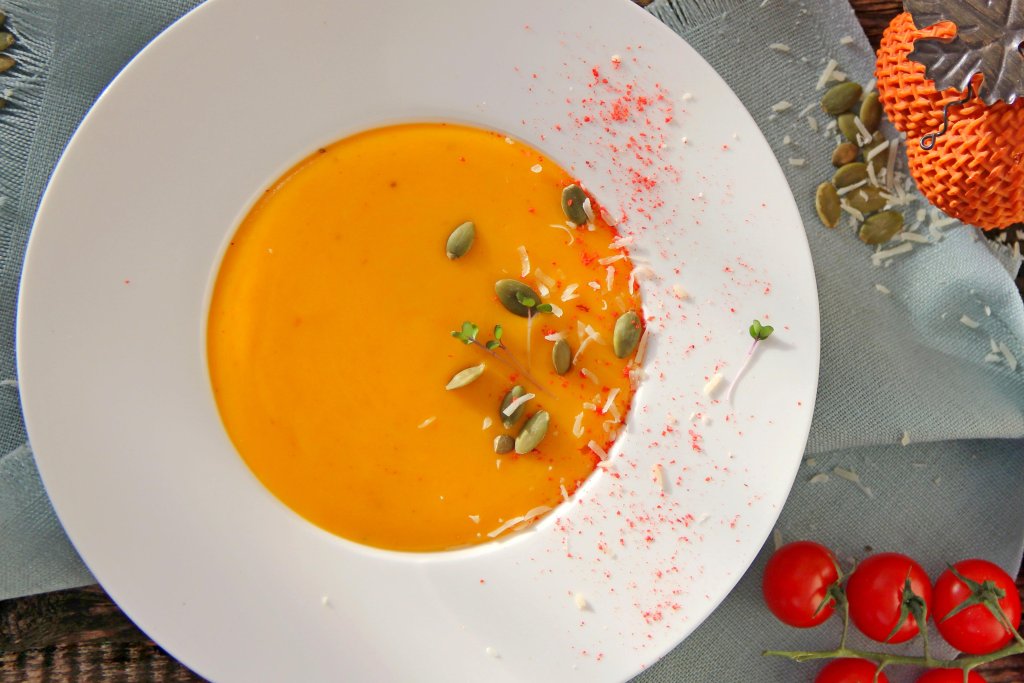 Яркий, вкусный, насыщенный тыквенный суп-пюре с плавленным сыром разлить по тарелкам и подать к столу, дополнив, по желанию, семечками тыквы. Это первое блюдо готовится без мяса и обжаривания овощей, а получается сытным.