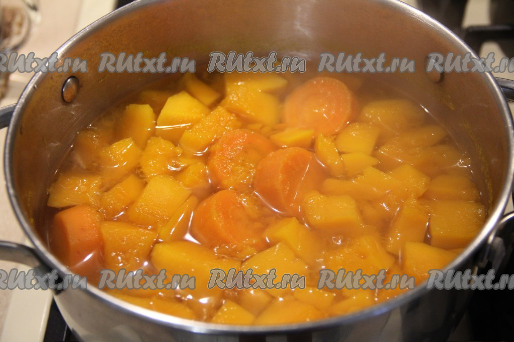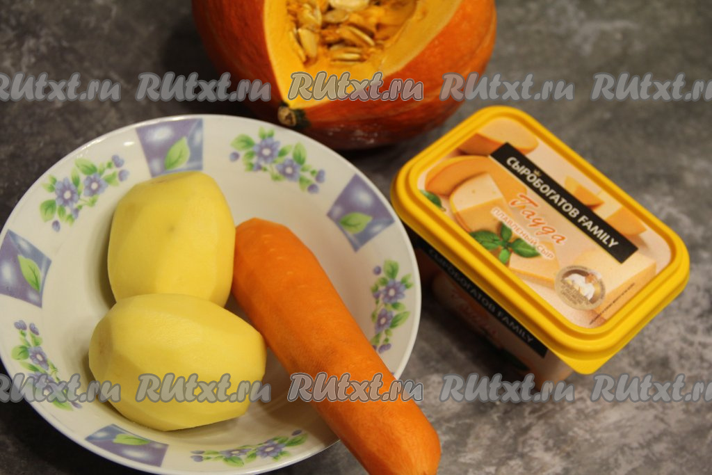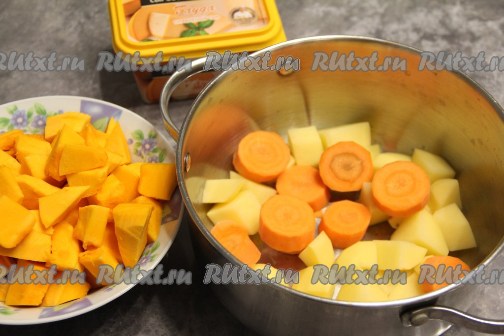 Картошку и морковь нарезать на средние дольки и поместить в кастрюлю, в которой будете варить суп. Тыкву очистить от кожуры, семечек и волокон. 500 грамм очищенной тыквы нарезать на кубики среднего размера.