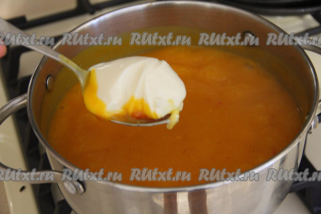 Перелить получившееся тыквенное пюре в кастрюлю, добавить соль и специи (я положила 1 чайную ложку паприки), перемешать суп-пюре, поставить на огонь выше среднего и, периодически помешивая, чтобы суп не подгорел, довести до кипения и уменьшить огонь.