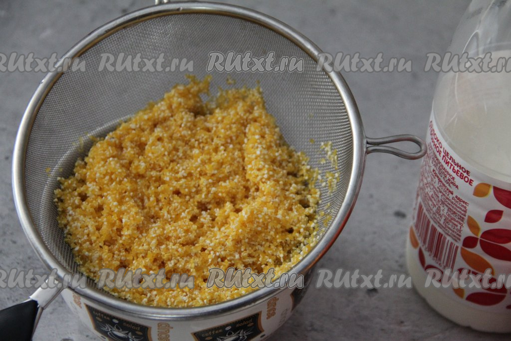 Кукурузную крупу всыпать в сито и промыть под проточной водой, лишней воде дать стечь.
