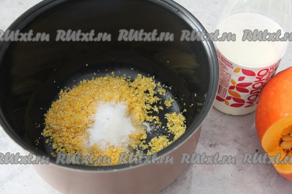 Перемешать молоко с кукурузной крупой и тыквой, установить чашу в мультиварку. Закрыть крышку и выставить режим "Каша" на 20 минут. После звукового сигнала каша будет готова.