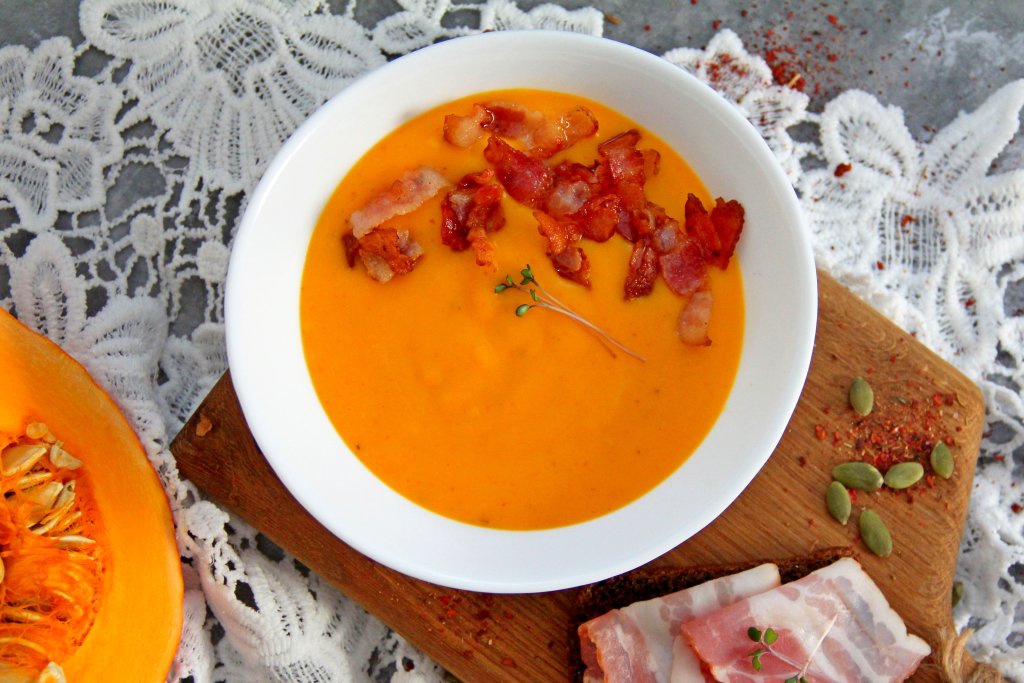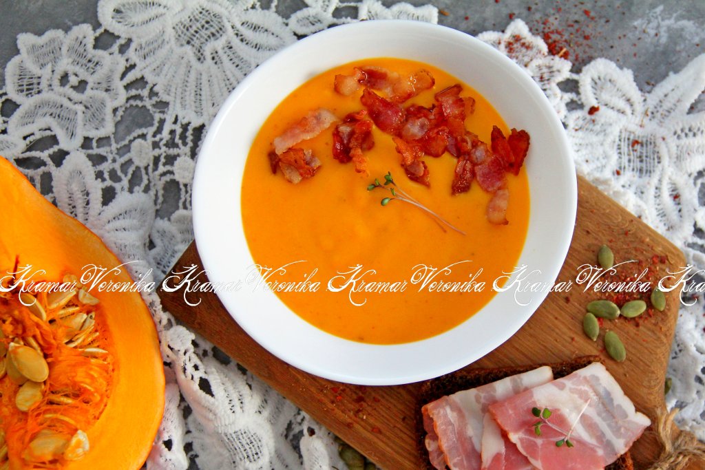 Очень вкусный, нежный, сытный тыквенный суп-пюре со сливками разлить по тарелкам и подать к столу вместе с кусочками бекона.