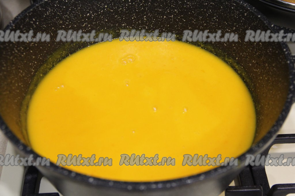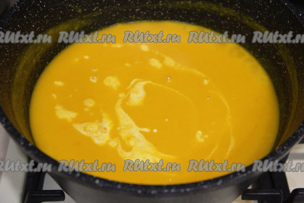 Поставить тыквенный суп-пюре на огонь, влить сливки, добавить пропущенный через пресс чеснок, перемешать.