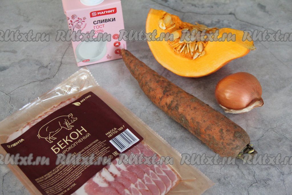 Предлагаю разнообразить меню и сварить нежный, бархатистый, ароматный и конечно же сытный тыквенный суп-пюре с беконом и сливками. Этот яркий, вкусный суп готовится с предварительной обжаркой овощей. Если у вас есть кастрюля с толстым дном, то можно пожарить все овощи прямо в кастрюле, а затем в этой же кастрюле сварить суп. Уверена, этот тыквенно-сливочный суп многим придётся по вкусу!