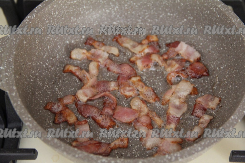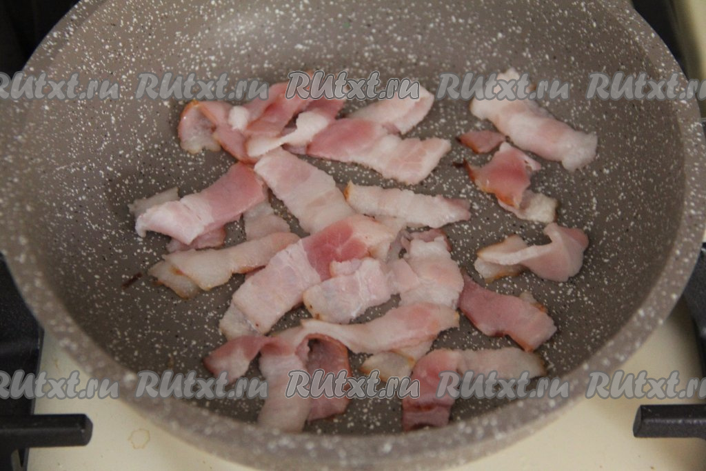 Обжарить бекон на среднем огне до золотистого цвета с двух сторон.