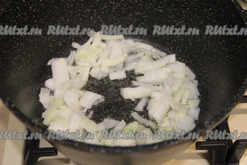 Лук и морковь очистить. В кастрюлю с толстым дном влить 2-3 столовых ложки растительного масла, разогреть его и выложить достаточно мелко нарезанный лук, обжарить его на среднем огне, иногда перемешивая, в течение 4-5 минут (до прозрачности лука).