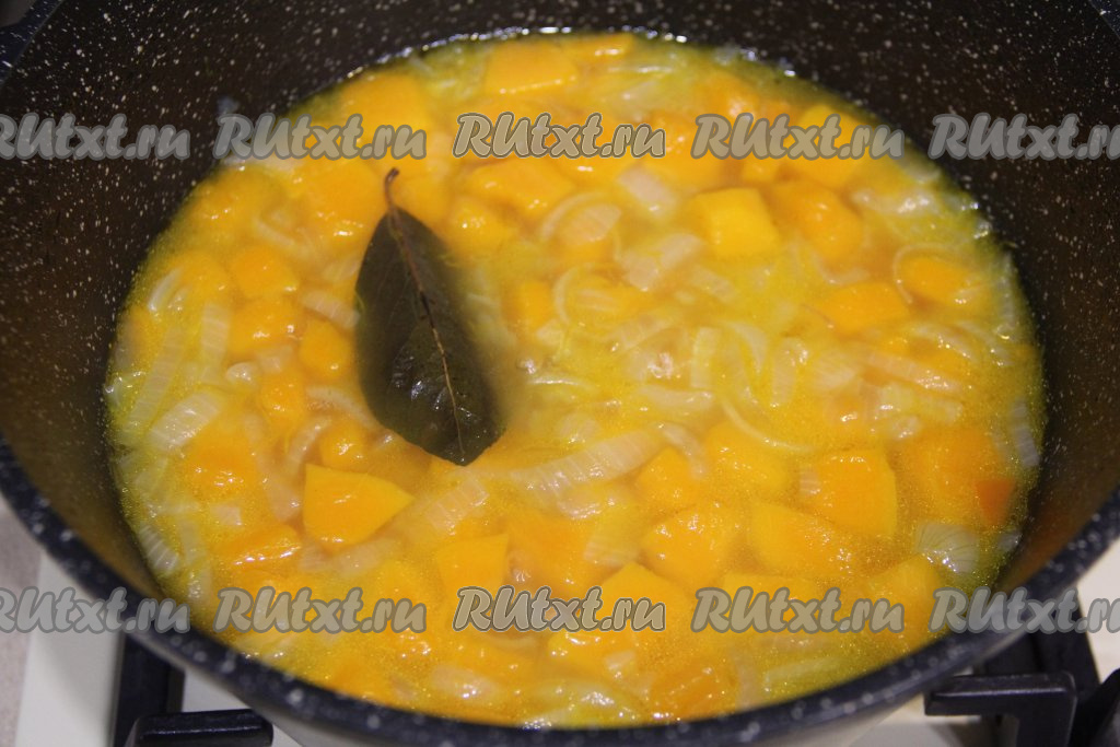 Влить в кастрюлю 1 литр воды, добавить лавровый лист, соль. После закипания воды варить овощи на небольшом огне минут 15 (до мягкости тыквы и морковки).