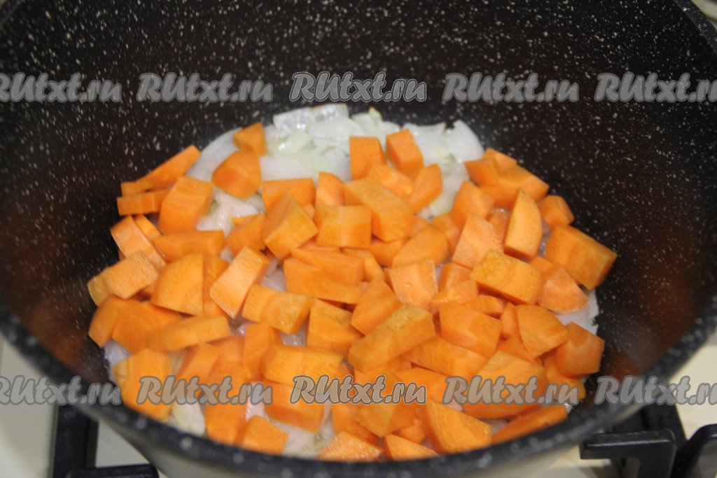 К луку, обжаренному до прозрачности, выложить морковку, нарезанную на средние кубики, перемешать и обжаривать овощи вместе 3-4 минуты, периодически помешивая.