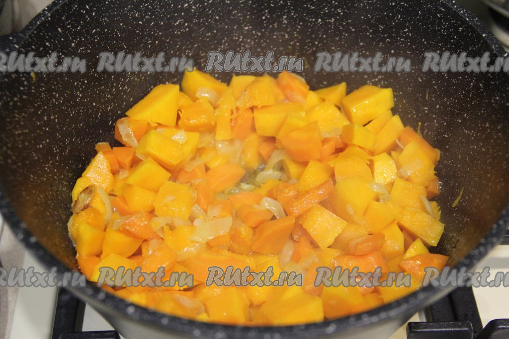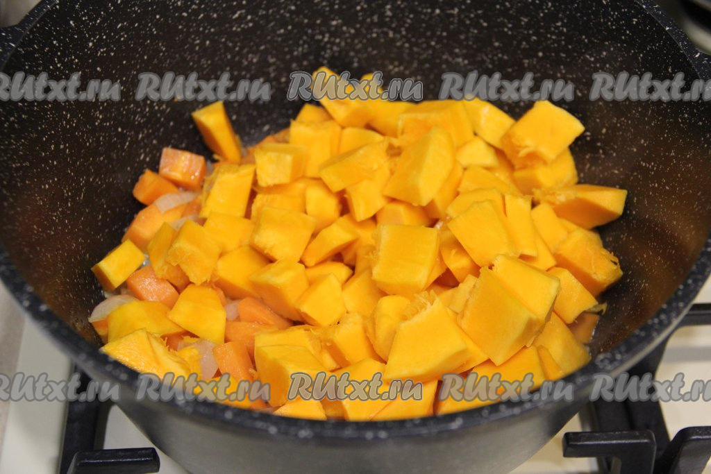 500 грамм тыквы, предварительно очищенной от семечек с волокнами и от кожуры, нарезать на средние кубики, добавить в кастрюлю, перемешать и обжаривать овощи минут 7.