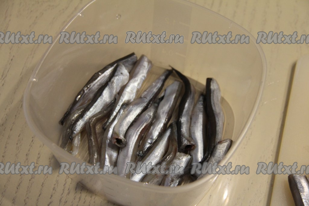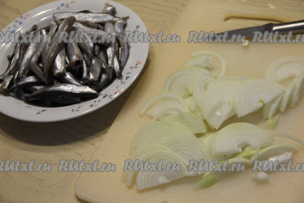 Мойву почистить, удалить голову и внутренности, обязательно убирая чёрную плёночку внутри брюшка. Лук почистить и нарезать полукольцами.