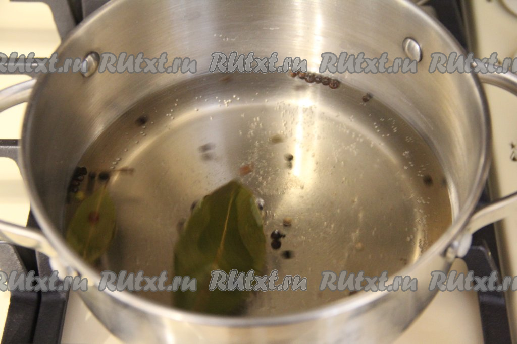 Приготовить маринад, для этого в кастрюлю нужно влить воду, добавить горошины перца, сахар, соль, лавровые листья.