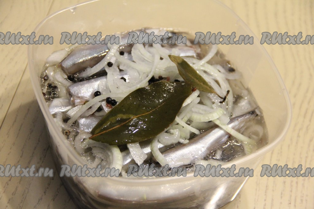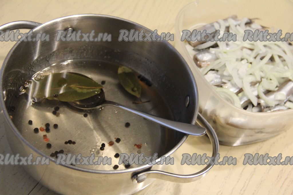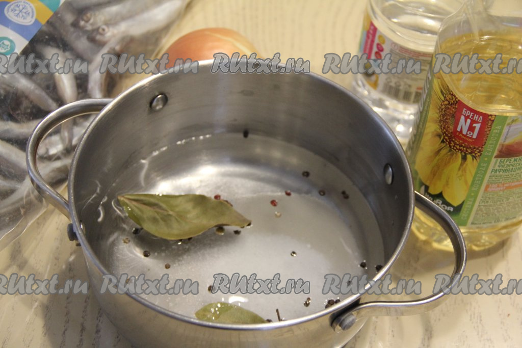 Влить остывший маринад в лоток с мойвой и луком. Добавить в лоток лавровый лист и горошины перца.