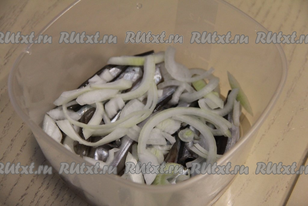 Поверх мойвы выложить часть лука.