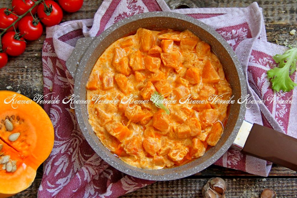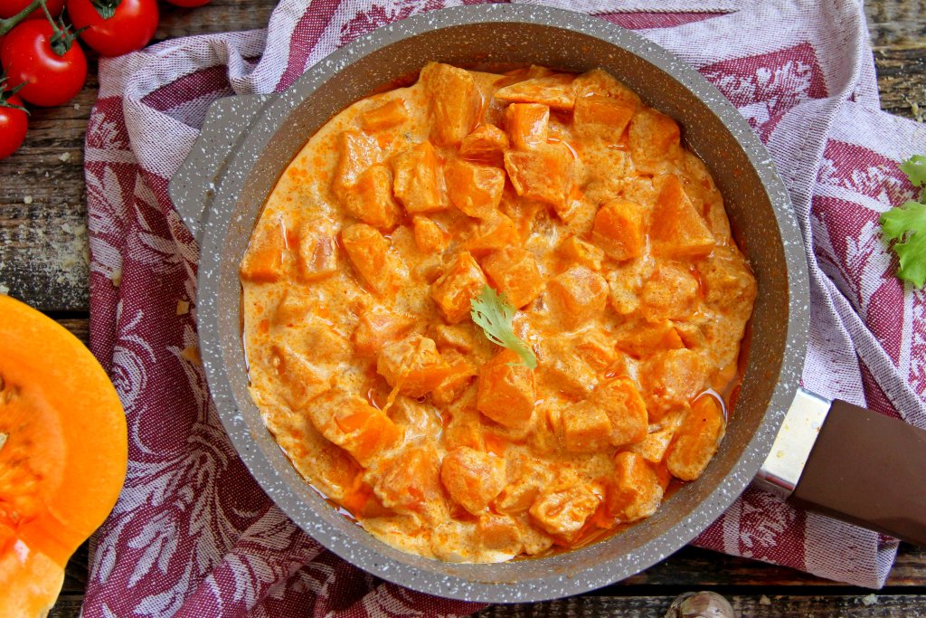 Предлагаю приготовить на сковороде тыкву, тушёную в сметане с чесноком. Блюдо получается очень вкусным, пикантным и ароматным. Аппетитные кусочки тыквы станут отличным гарниром к мясу, птице. Это блюдо получается достаточно сытным, поэтому его можно подать к столу и в качестве основного. Просто, сочно и вкусно, попробуйте!