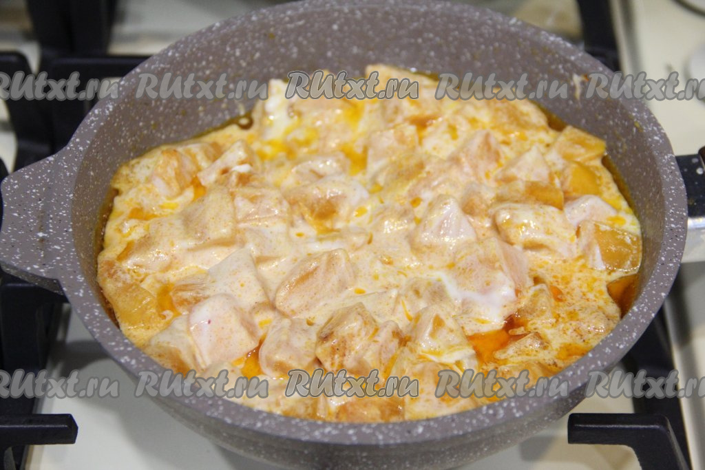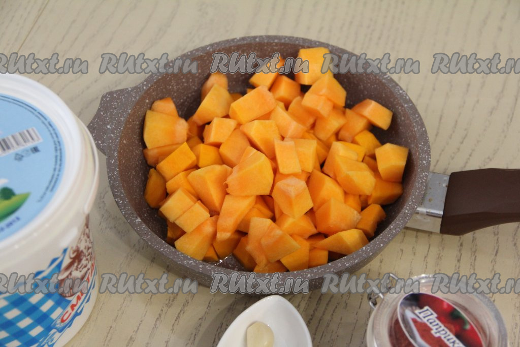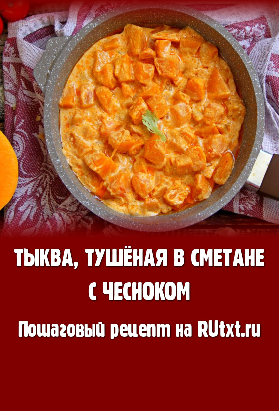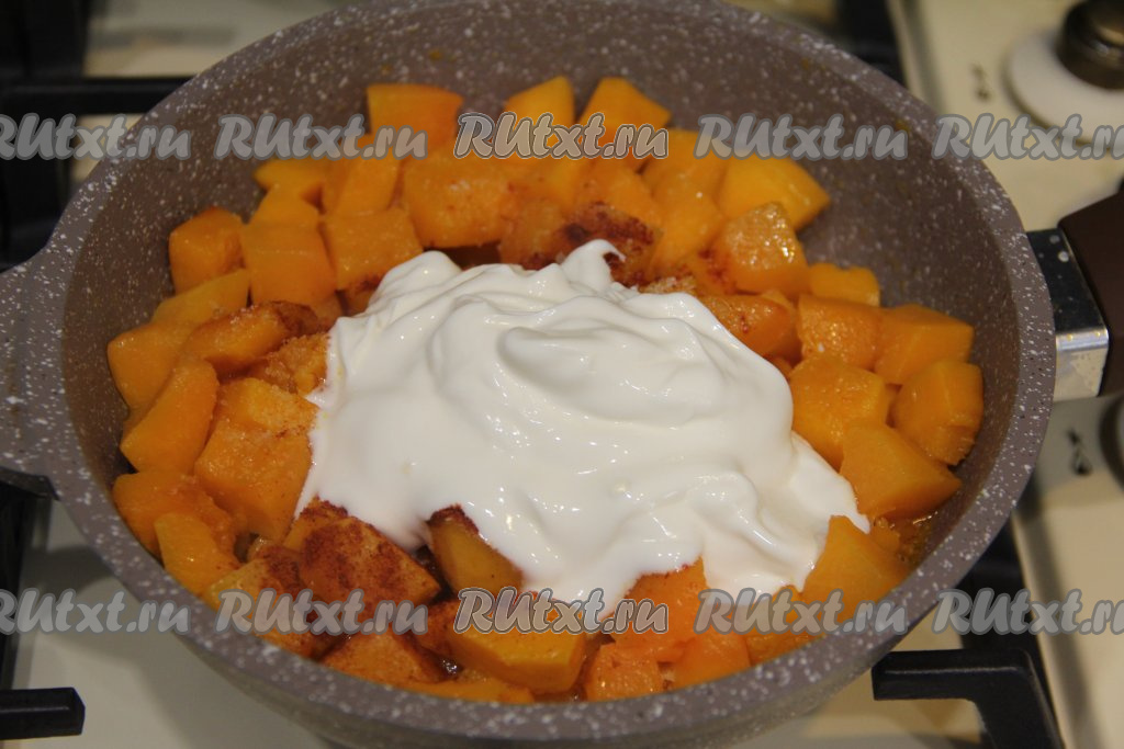 Перемешать тыкву со сметаной и чесноком, убавить огонь до минимума и томить под крышкой примерно 10 минут (кусочки тыквы должны стать достаточно мягкими и легко прокалываться вилкой).
