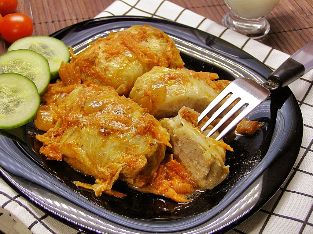 Достаём форму из духовки. Сочные, нежные и очень вкусные голубцы из пекинской капусты вместе с томатно-сметанным соусом, в котором они запекались, раскладываем по тарелкам и подаём к столу со свежими овощами или гарниром (например, с гречкой или рисом).