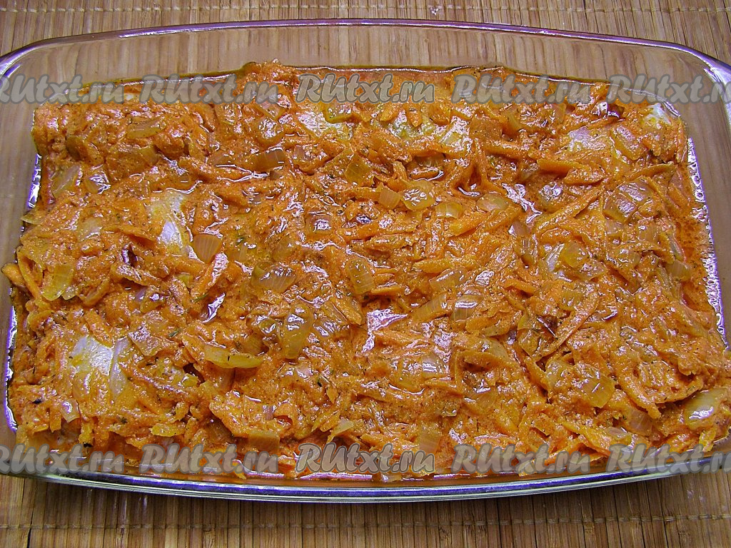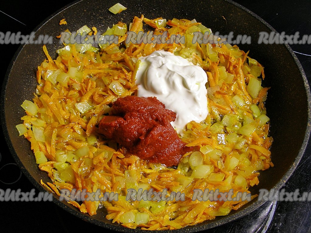 Прогреваем в сковороде растительное масло, выкладываем морковку с луком и обжариваем овощи на среднем огне минут 5 (до мягкости), периодически помешивая. Затем добавляем томатную пасту, сметану и ещё раз хорошо перемешиваем.