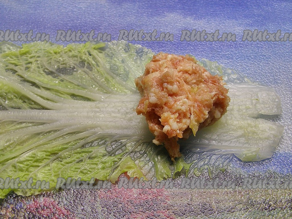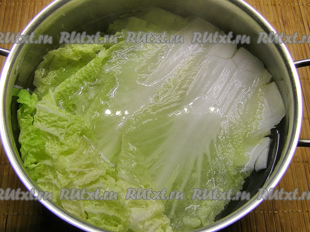 Заливаем листья пекинской капусты кипятком, оставляем минут на 5 в горячей воде, затем воду сливаем и даём листьям немного остыть.