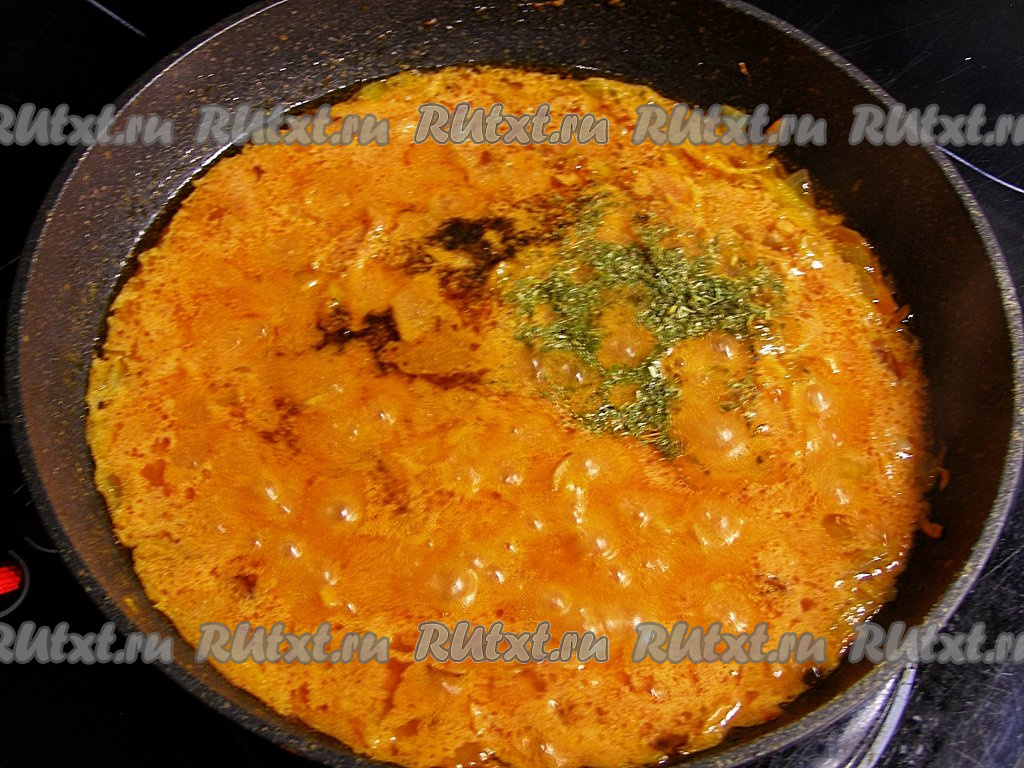 Вливаем в сковородку с луком и морковью воду, добавляем соль по вкусу. По желанию можно добавить специи на свой вкус и сушёную зелень. Доводим томатно-сметанный соус до кипения и снимаем с огня.