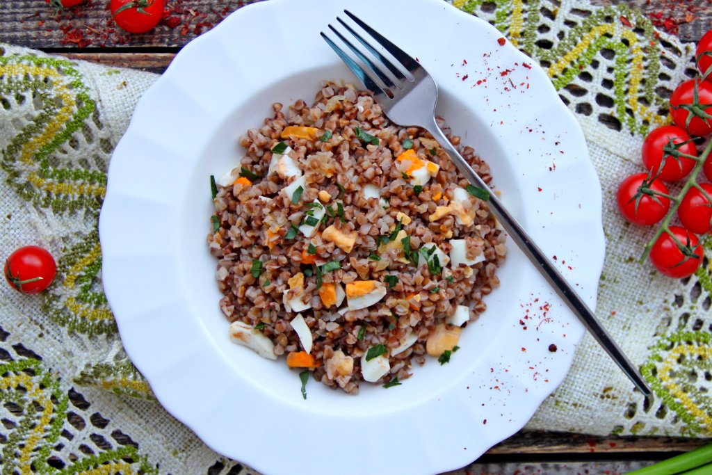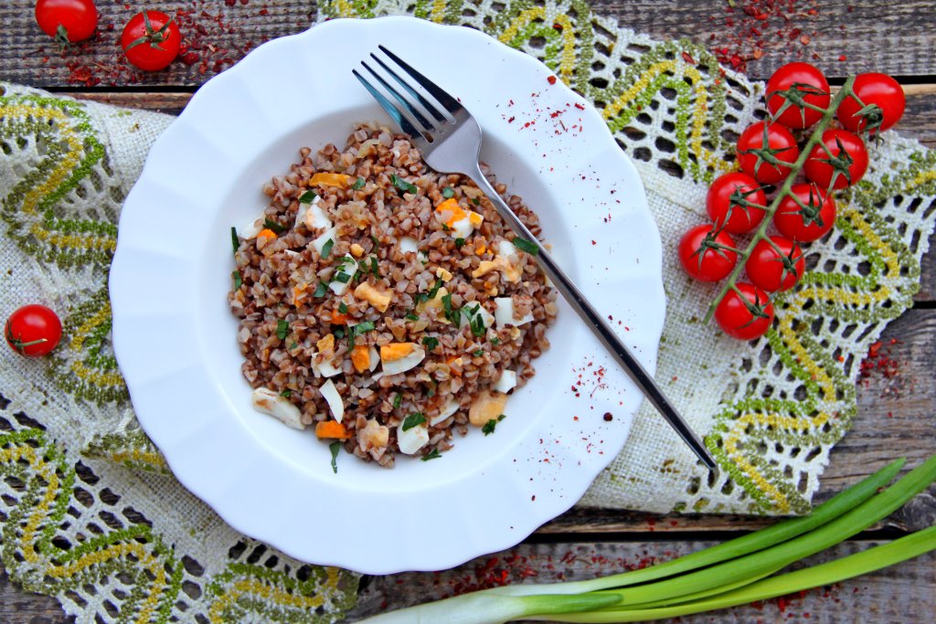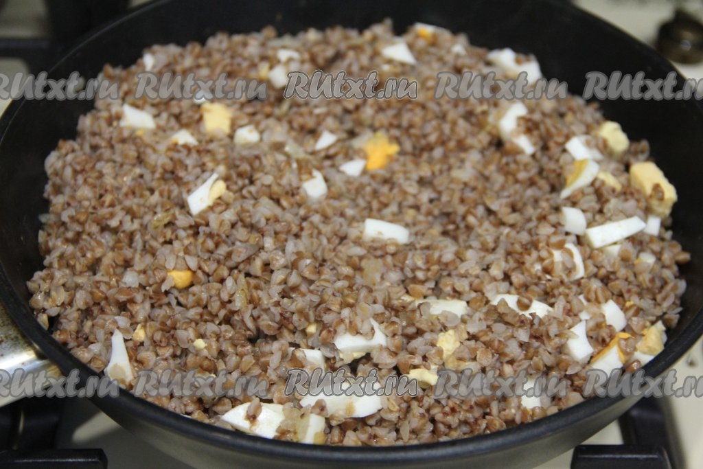 Перемешать гречку с варёными яйцами и жареным луком.