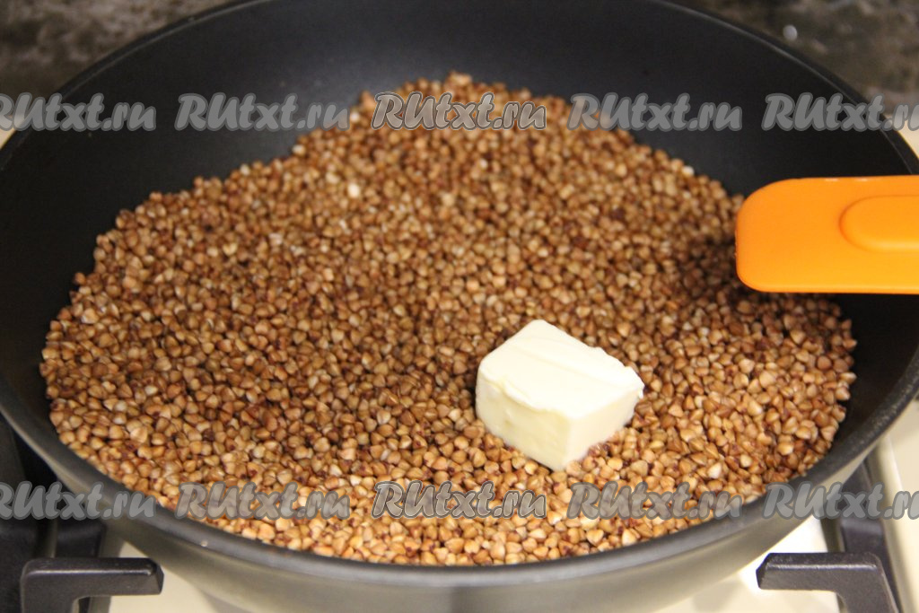 Затем добавить кусочек сливочного масла и обжарить гречку, помешивая, до расплавления масла.