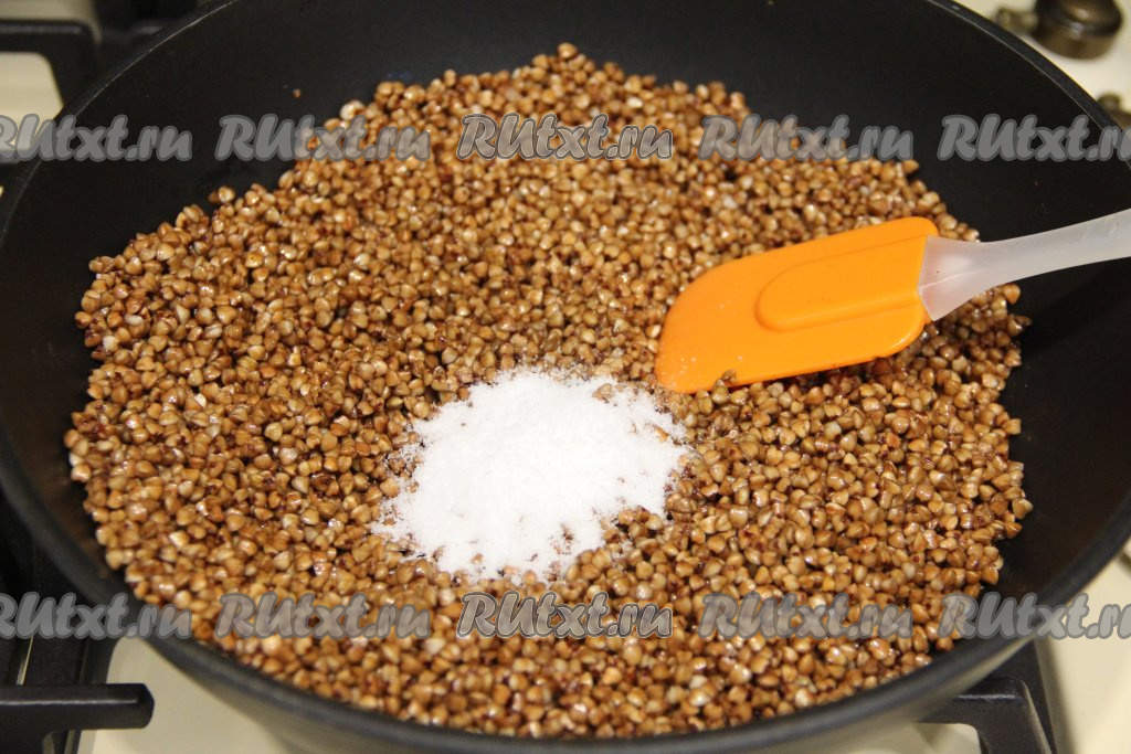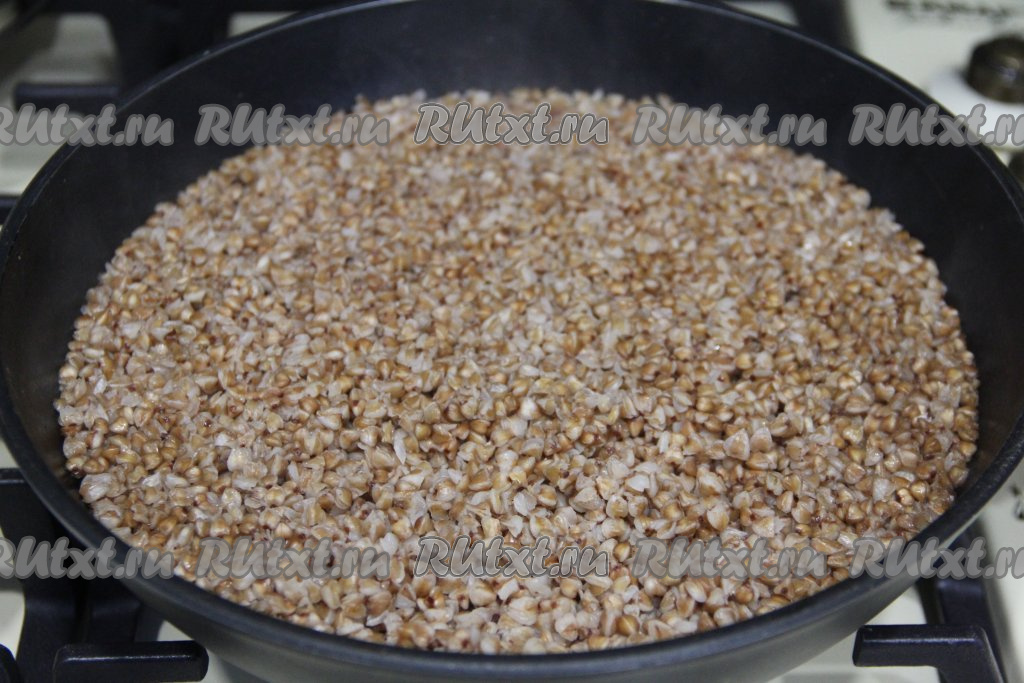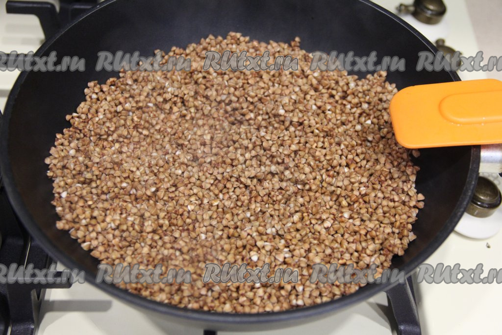 Сухую сковороду разогреть, выложить подготовленную гречку и обжарить её на среднем огне в течение 5-7 минут, периодически перемешивая.