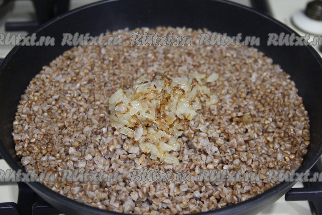 После того как гречка сварится (вода испарится, а гречка станет достаточно мягкой), добавить к каше жареный лук.