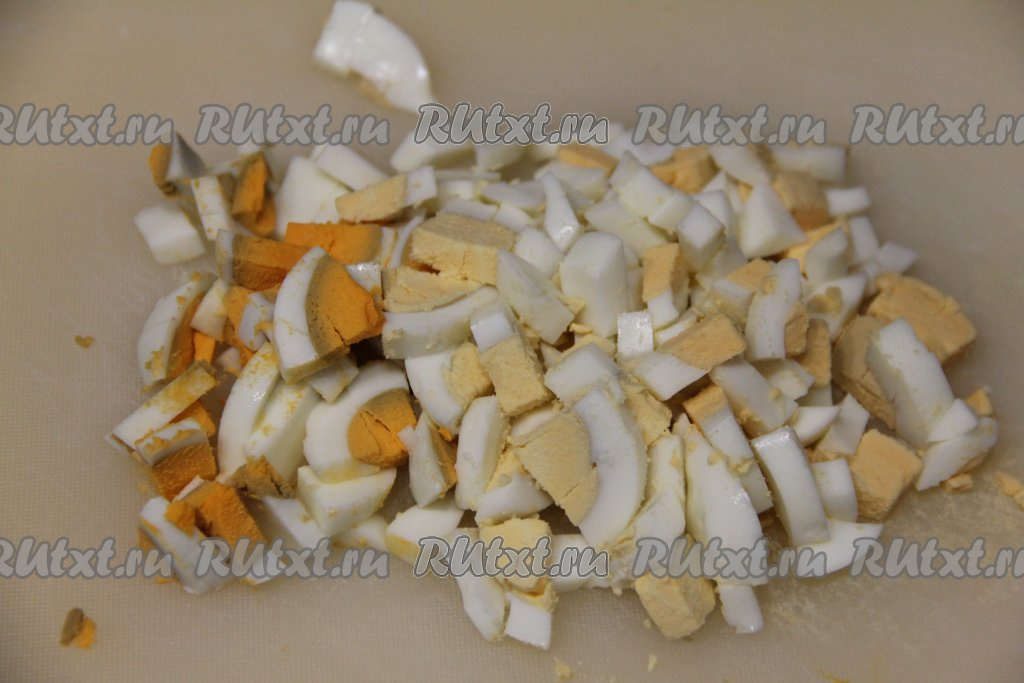 Пока гречка варится, нарезать очищенные яйца на мелкие кубики.