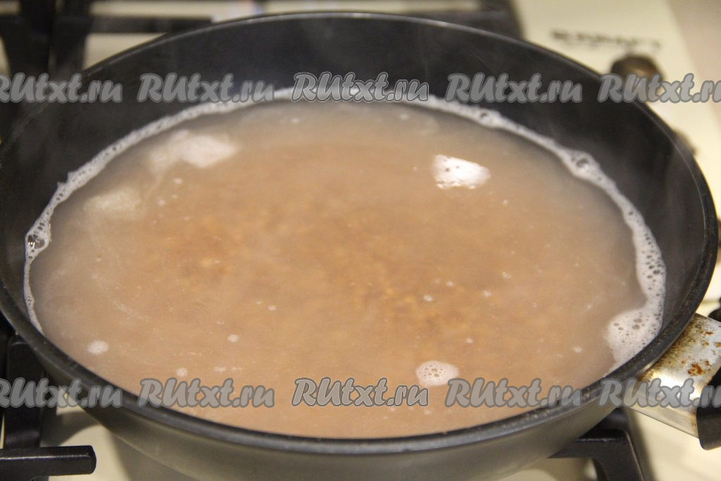 Как только вода закипит, убавить огонь до минимума, накрыть сковороду крышкой. Варить гречневую кашу минут 20 (до полного испарения воды и готовности гречки).