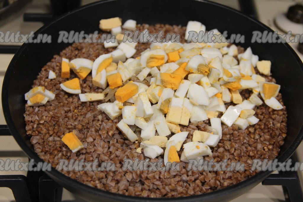 Сразу же добавить к гречке нарезанные варёные яйца.