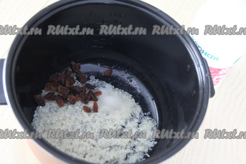 Рис и изюм выложить в чашу мультиварки, добавить соль и сахар.