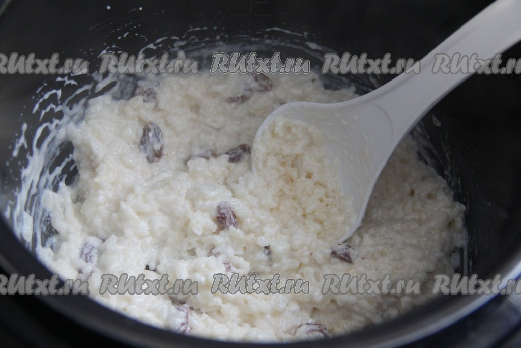 После звукового сигнала, сообщающего об окончании программы, в чашу мультиварки с молочной рисовой кашей с изюмом добавить сливочное масло, перемешать.