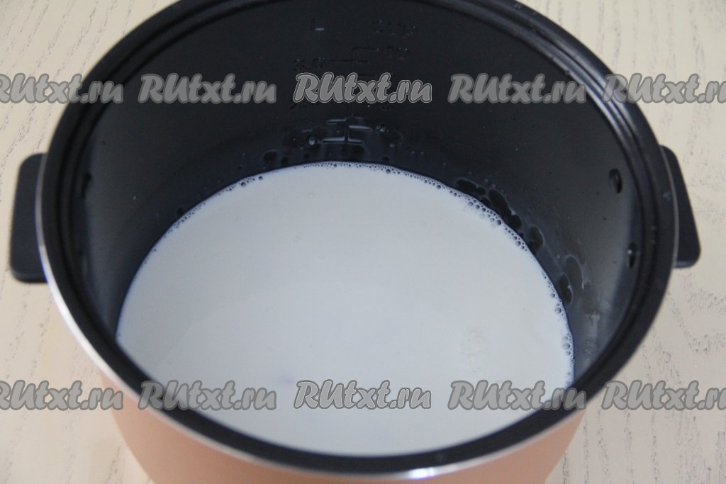 Сюда же влить молоко, перемешать. Поместить чашу в мультиварку и закрыть крышку. Выставить режим "Молочная каша" на 35 минут.