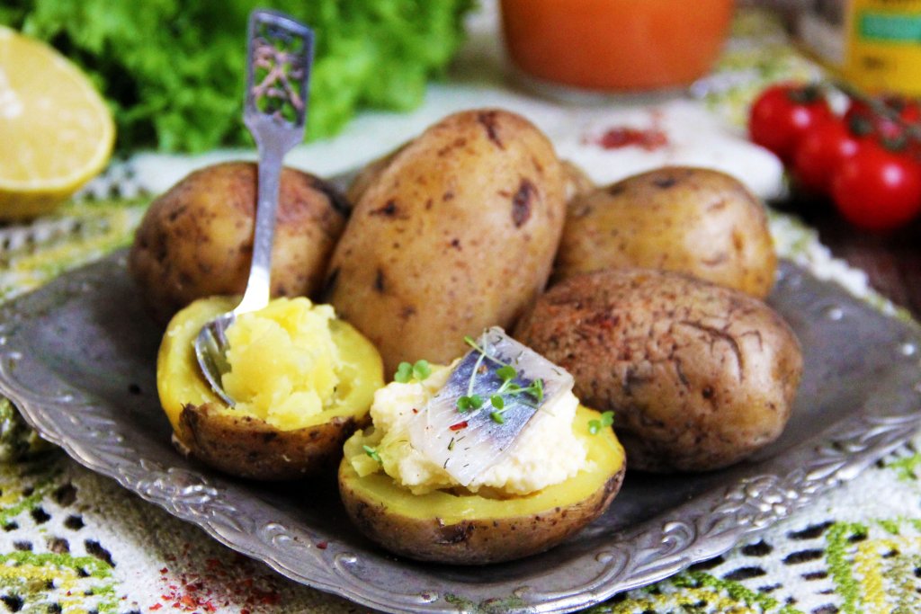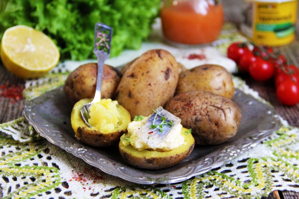 Картофель подать к столу в горячем виде. Картошечка получается хорошо пропечённой внутри. Я разрезала картошку пополам, смазала плавленным сыром и подала к столу с селёдочкой. Блюдо получилось и простым, и вкусным, и сытным.