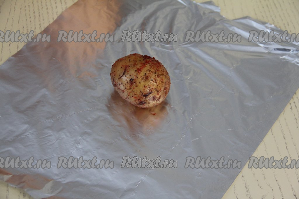 Хорошо перемешать картошку со специями и маслом. Выложить каждую картошину на отдельный кусок фольги. Завернуть каждую картошину в фольгу.