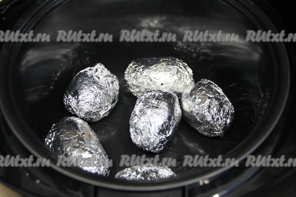 Картошку, завёрнутую в фольгу, выложить в чашу мультиварки. Закрыть крышку и выставить режим "Выпечка" на 1 час.