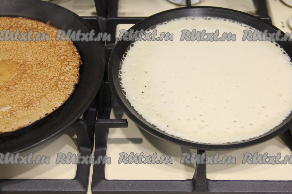 Перед выпечкой очередного блина сковороду нужно смазывать маслом только по мере необходимости. Я смазывала сковородку маслом только перед жаркой первого блина.