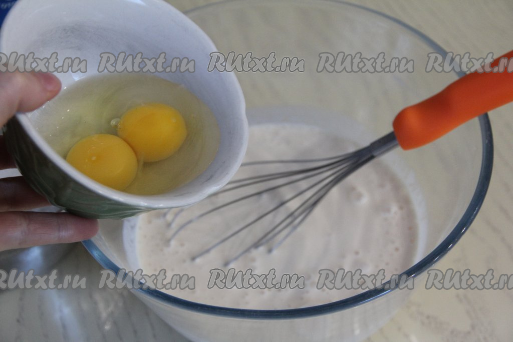 Затем в смесь ряженки и соды добавить яйца, перемешать венчиком.