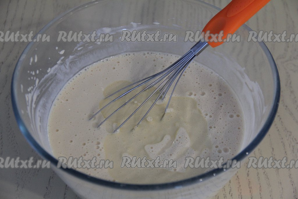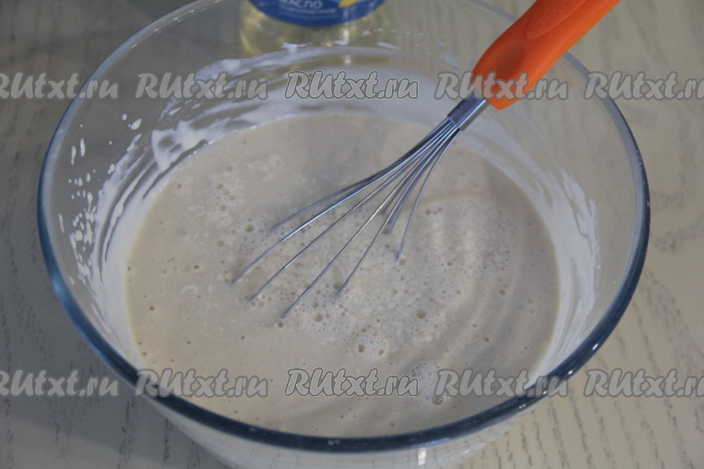 Перемешать блинное тесто венчиком до однородности. Тесто получится достаточно вязким.