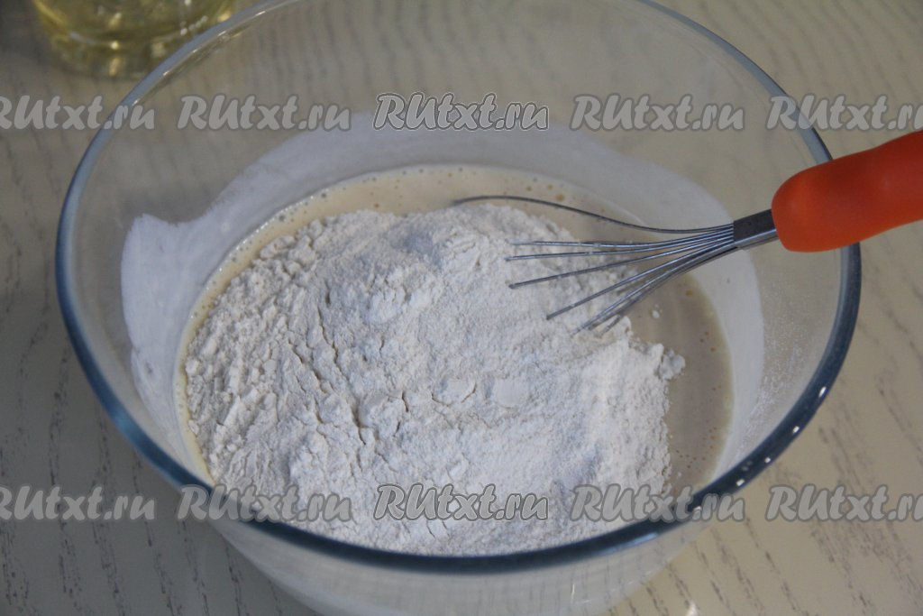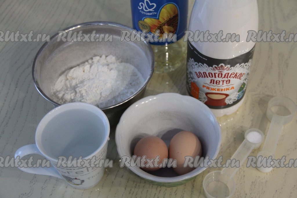 В смесь ряженки и яиц всыпать просеянную муку.