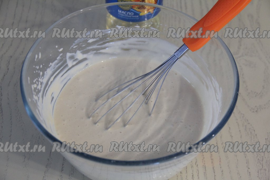 После того как будет добавлен кипяток, влить в тесто растительное масло, перемешать.