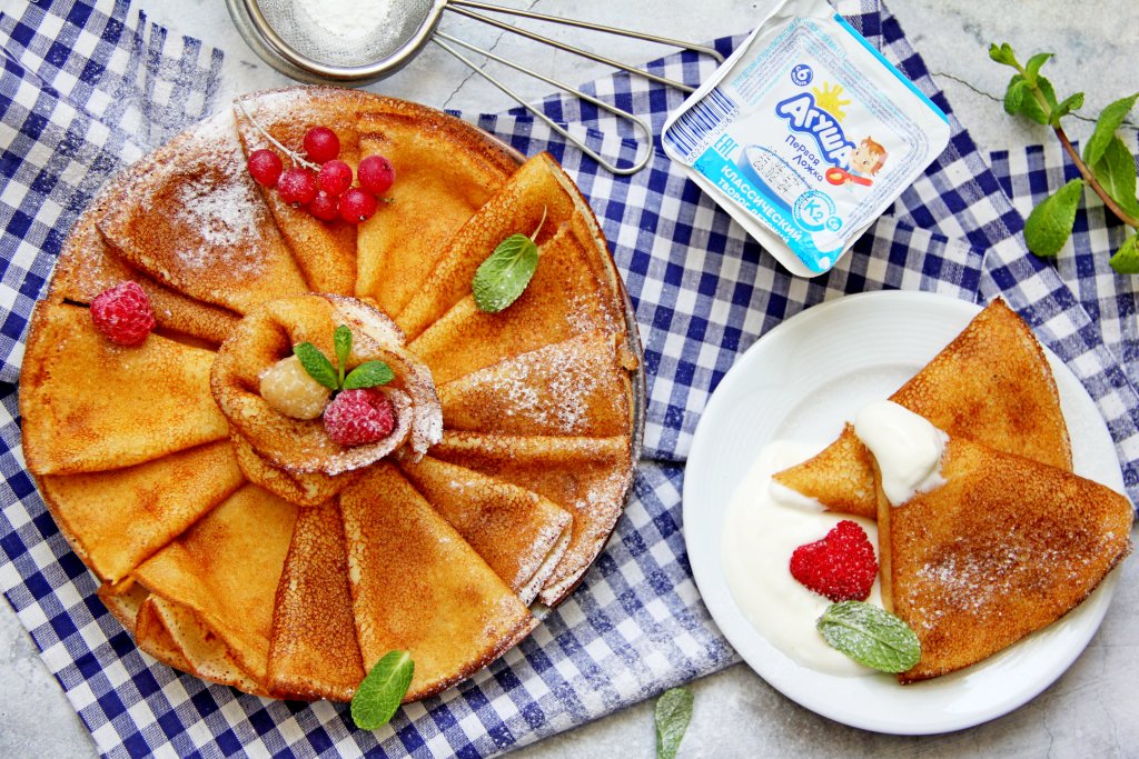 Вкуснейшие, нежные блины, приготовленные с добавлением детского творожка "Агуша", подать к столу в горячем виде.