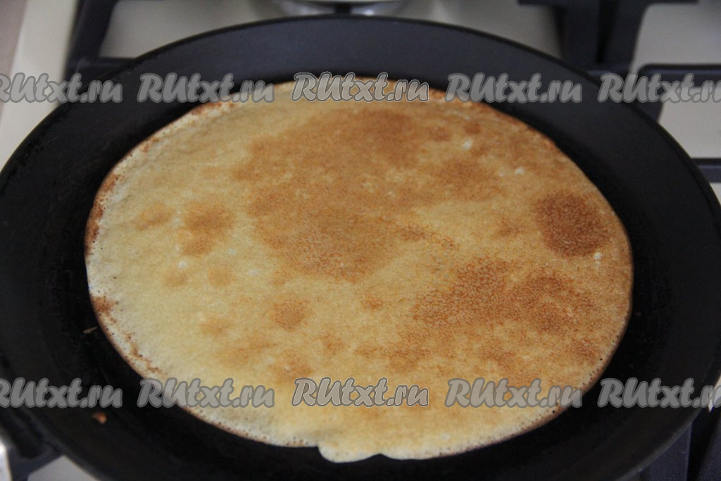Очень хорошо разогреть сковороду, перед выпечкой первого блина можно немного смазать сковородку растительным маслом. Вылить половник теста, равномерно распределяя тесто по дну сковородки. Выпекать блинчик до золотистости с двух сторон на умеренном огне, затем переложить на тарелку. Один за другим пожарить все блины.