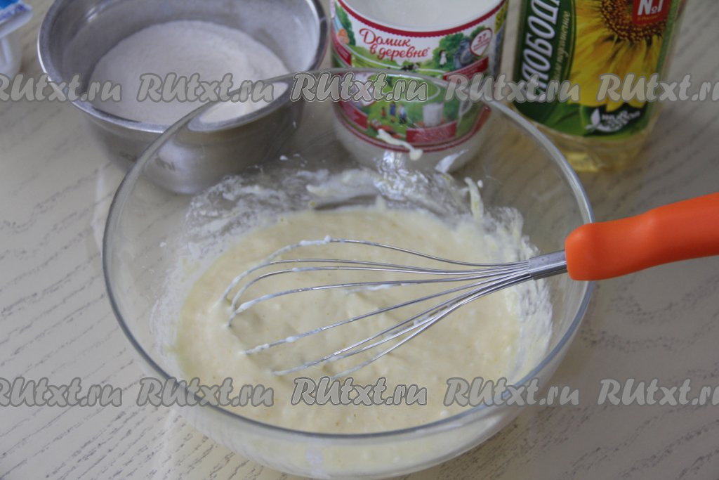 Перемешать яично-творожную массу венчиком до однородности.