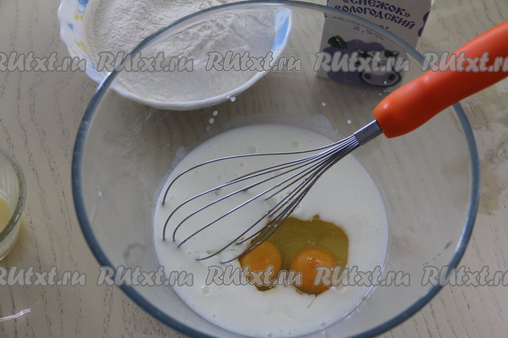 Затем в смесь "Снежка" и соды добавить яйца, перемешать венчиком.