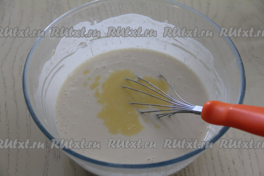 Сливочное масло растопить в микроволновке (или на плите), дать ему немного остыть, а затем влить в тесто, хорошо перемешать.
