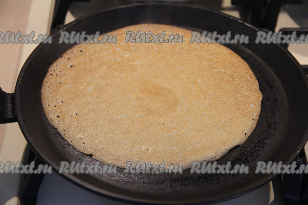 Сковороду хорошо разогреть, слегка смазать растительным маслом, влить немного теста, равномерно распределяя его по дну сковородки.