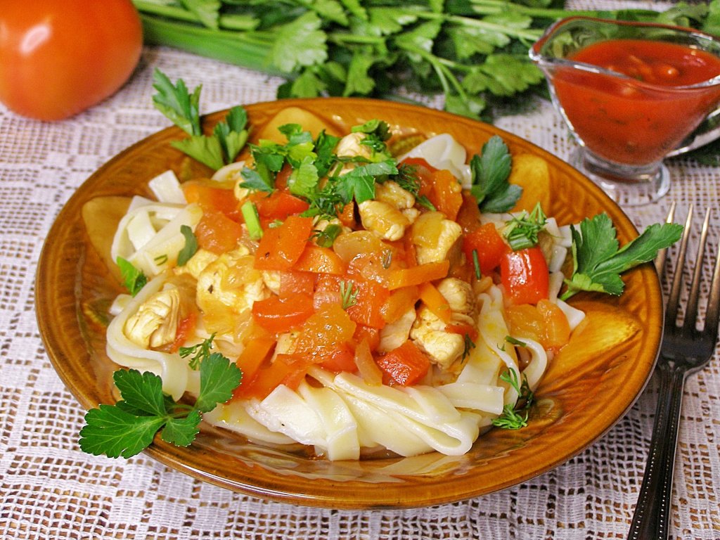 Лагман - это блюдо среднеазиатской кухни. Основа лагмана - лапша, которая заправляется густым мясным соусом с овощами. Вариантов этого блюда немало. Чаще всего в состав лагмана входит лапша, приготовленная в домашних условиях. В этот раз предлагаю немного сэкономить время и приготовить лагман с курицей, овощами и отваренной покупной лапшой. Блюдо получается и вкусным, и ароматным, и сытным. Сочетание мягких кусочков куриного мяса, аппетитных овощей и лапши - очень удачное, поэтому лагман, приготовленный по этому рецепту, наверняка, понравится всей семье!