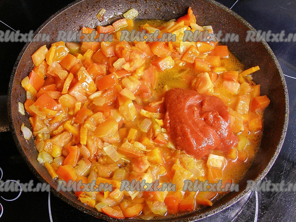 Добавляем к протушившимся овощам томатную пасту, перемешиваем, прогреваем 1-2 минуты.