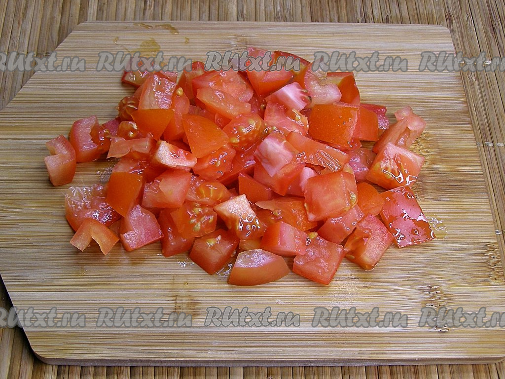 С помидоров, по желанию, удаляем шкурку, затем нарезаем на небольшие кубики.